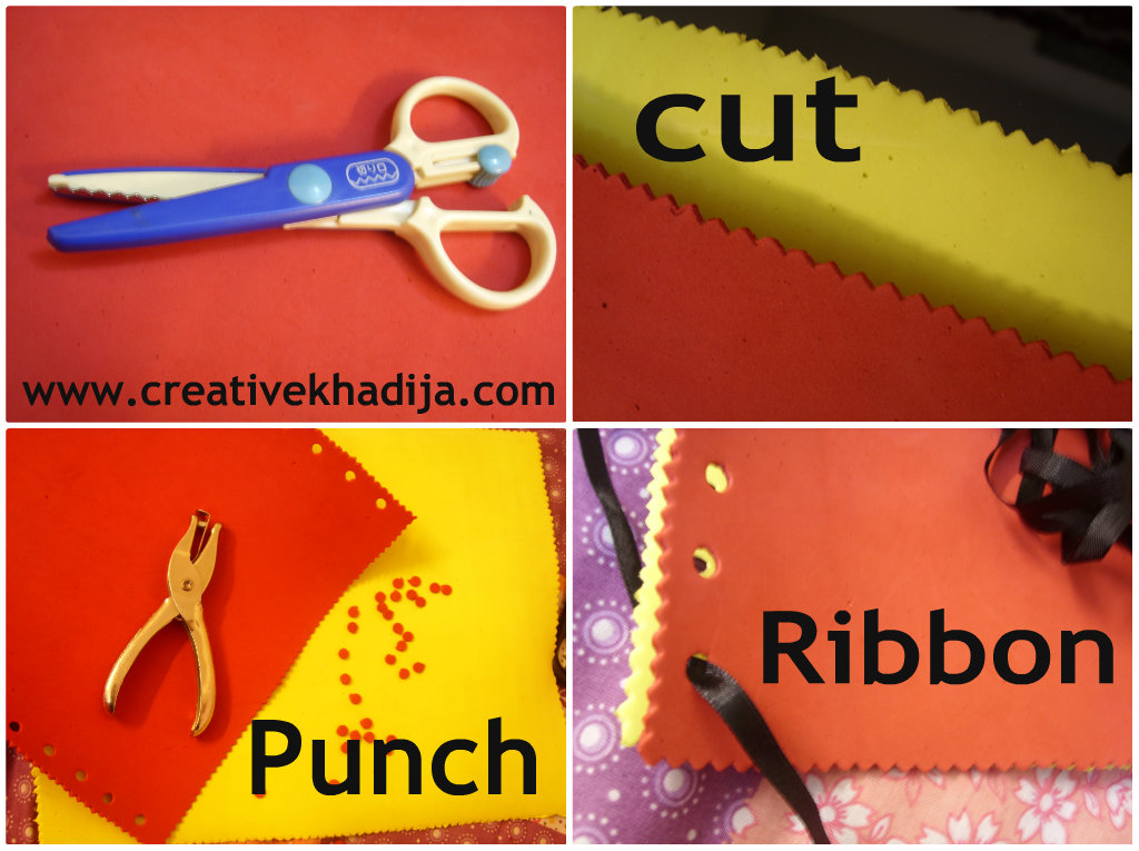 All you need to have is 1- craft foaming sheet of any color, 2-scissor(I use zigzag) 3-paper punch 4-Ribbon