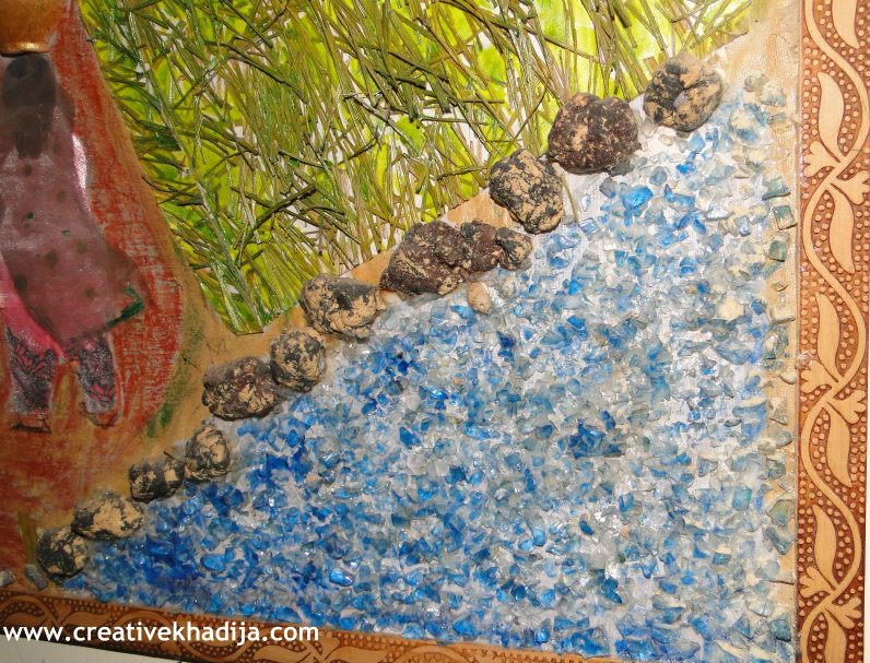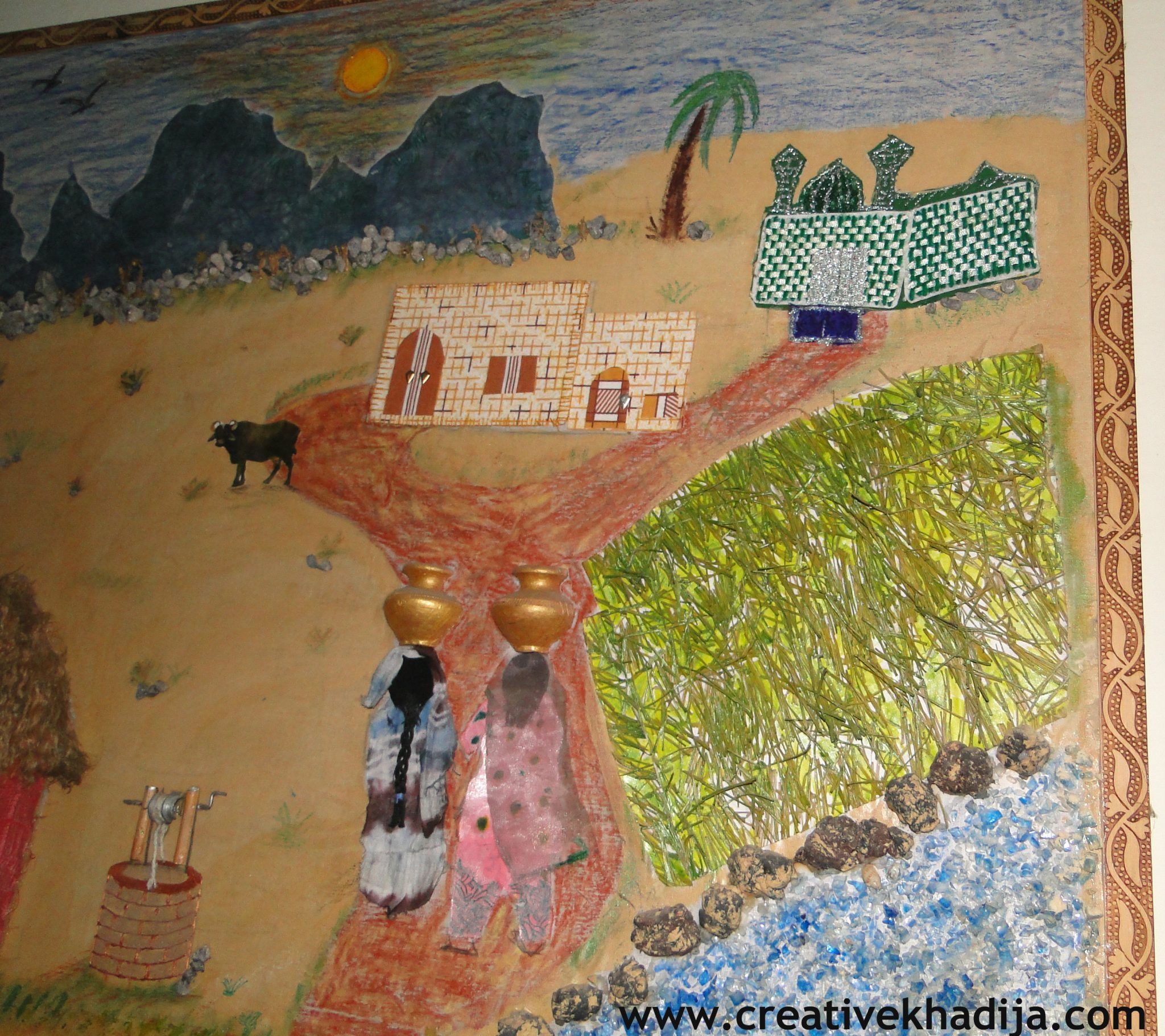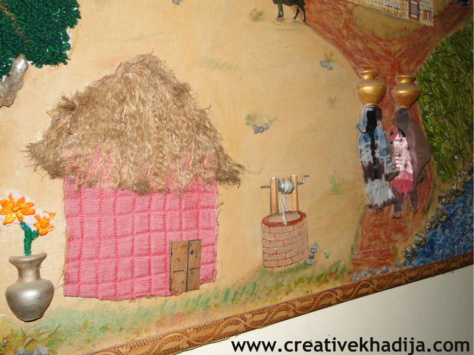 In this picture, I am sharing a view of rural area & a village scene. in right corner I am showing water with glass mosaic & the stones made by clay. then I paste orignal grass but spray painted with green.. the two ladies are holding mud water pots & wearing tie & dye+silk paint dress..the house is made with applique technique & there is a small well also visible..
