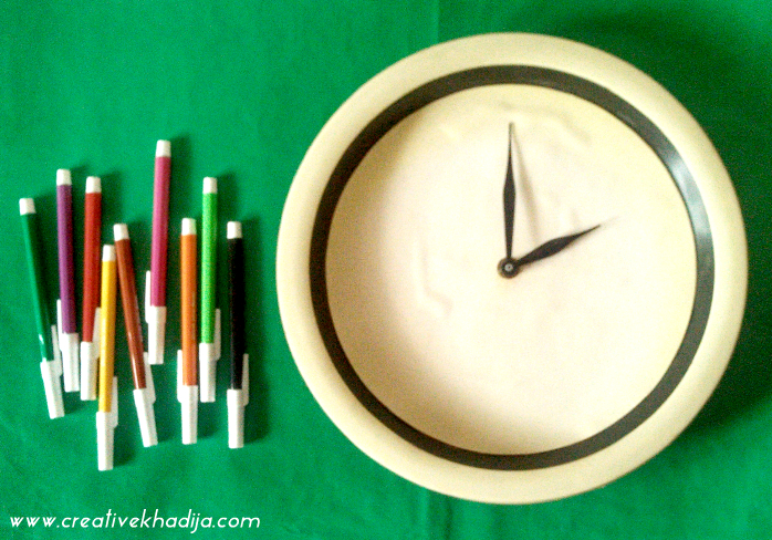 Here it is the plain wall clock, Before applying washi tape, First I did some doodle draw with black marker & fill it with colorful markers.