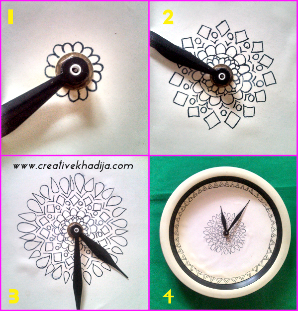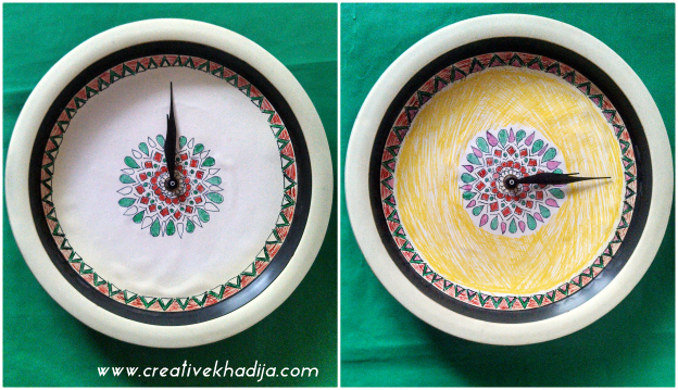 I paste the strip of washi tape on the clock plastic border & one by one complete it. Then I made four plus designs to mention 12-3-6-9 & it’s Done! I coated with mod podge then. Yellow color is dim now because of coating.