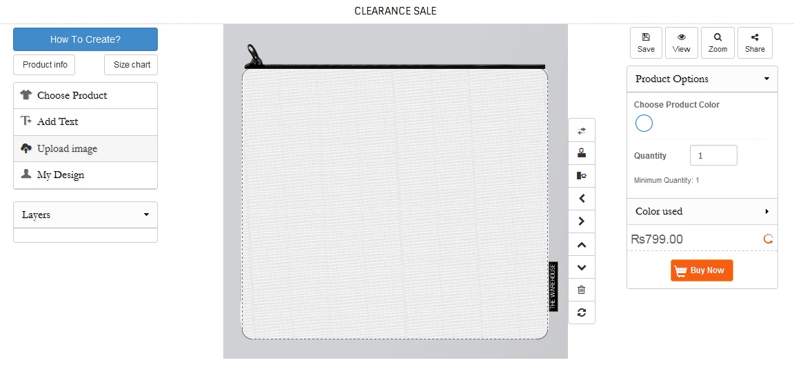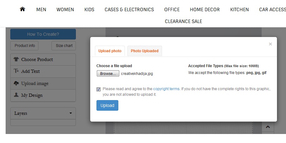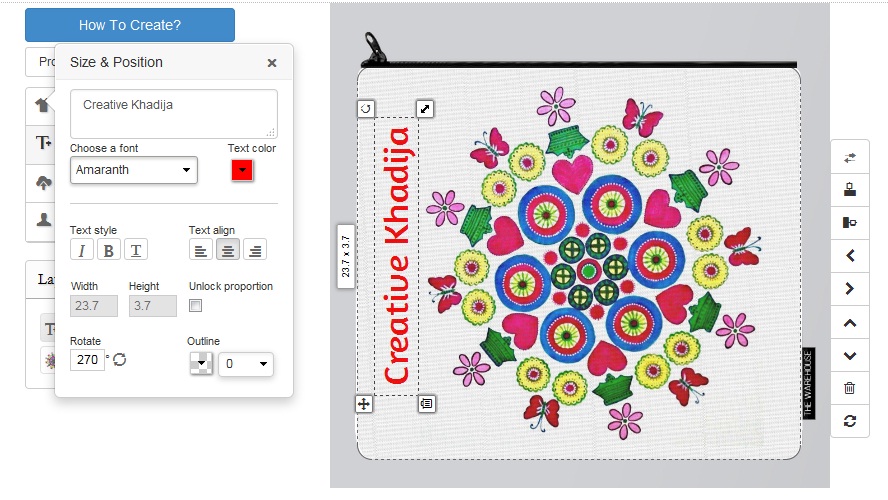 I choose a make-up pouch for customization, Here on the sidebar you can see options Add Text & Upload Image. So I upload a Creative Khadija Logo jpeg image from my folder.
