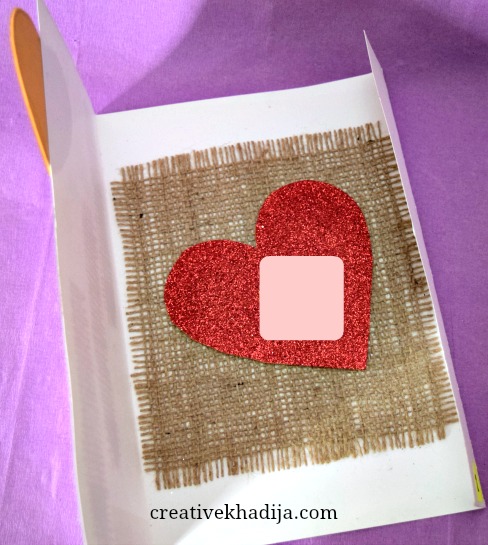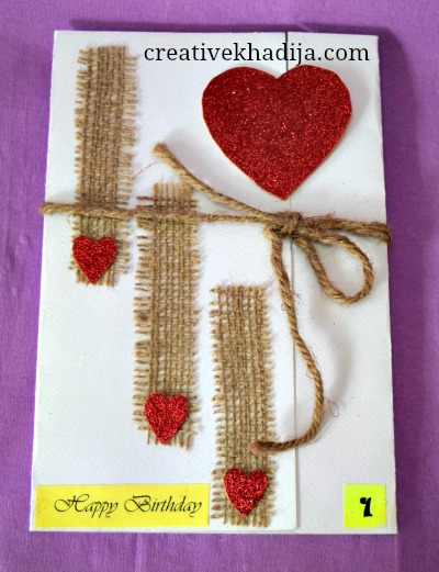 I embellished this card with jute fabric pieces. I pasted red glitter hearts on it. I wrap it with a jute thread as well.