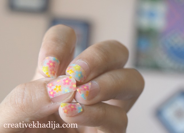 I simply applied the tapes on my nails & with scissors, I cut it carefully. Rub on & apply nail lacquer. Wait until it gets dry! Ta-Da. Its done. I choose a multi colored washi tape with small flowers on it, This can be perfect with several color dresses.