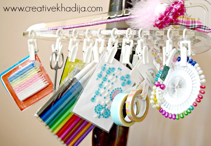 My crafty goodies! Some candles, washi tapes, stickers & markers. Perfectly hanged near my craft table. Simple yet fun way to organize!