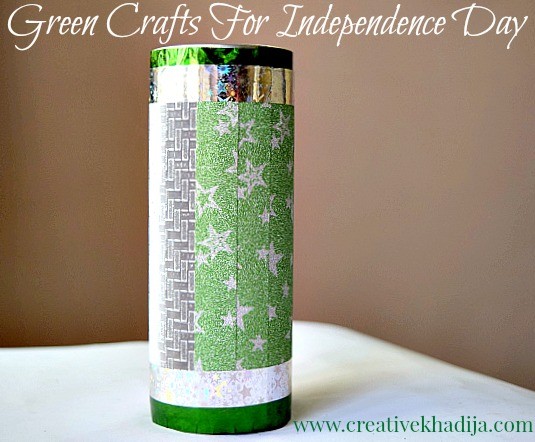 I am designing just one pencil here, I want to give you an idea how you can make some in other colors too. I choose green chevron design washi tape for designing this pencil. The other tape is glitter tape which I have used on my Tin Can vase independent day craft idea. Sharing this idea with green washi tape & silver portion according to Pakistani flag colors.