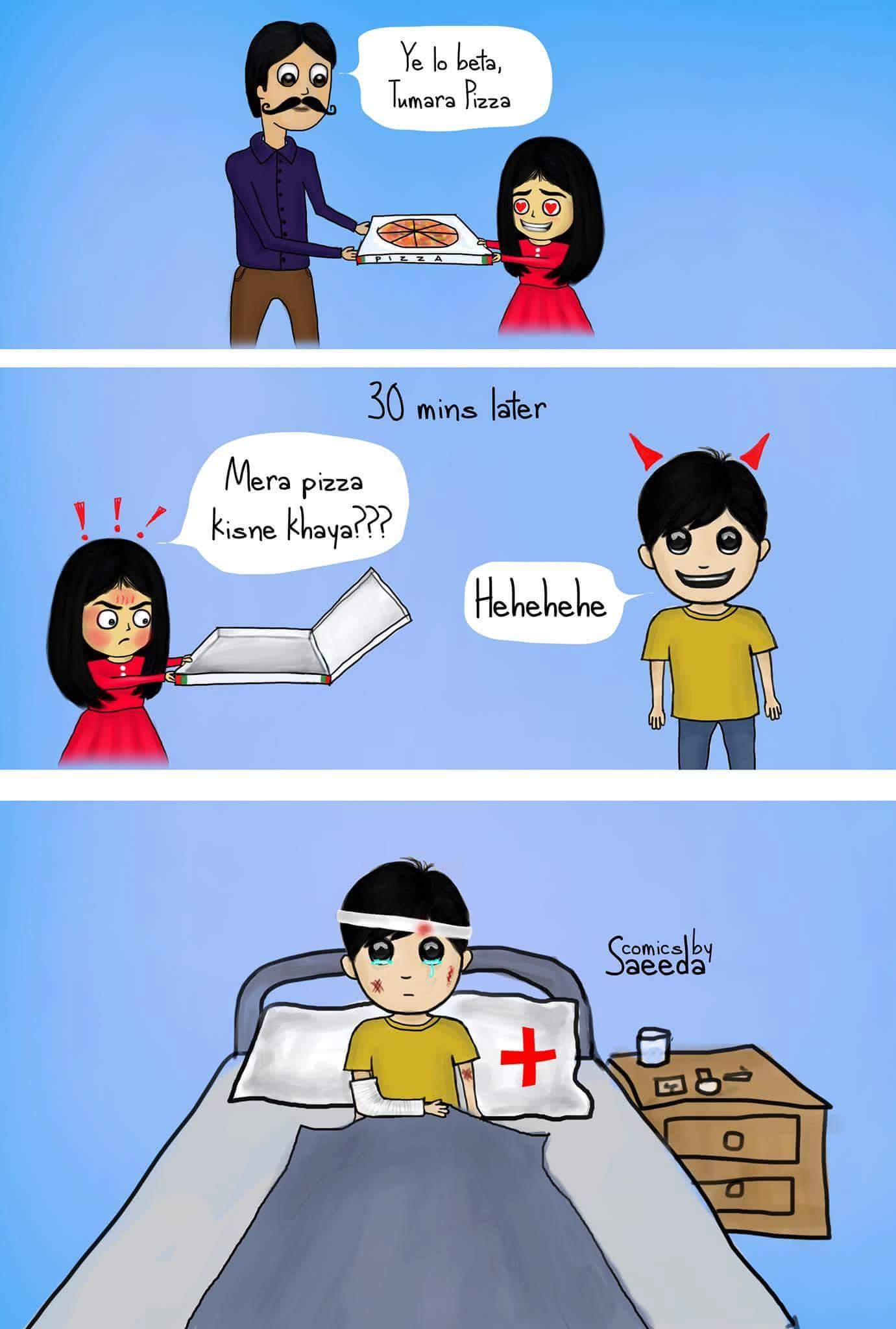 No one dares to eat Munni’s pizza. Unless they want a free ride to the hospital. haha