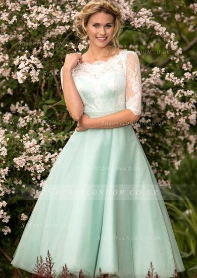 Mint Green Lace overlay Bodice A-line Tea Length Short Prom Dress with Half Sleeves