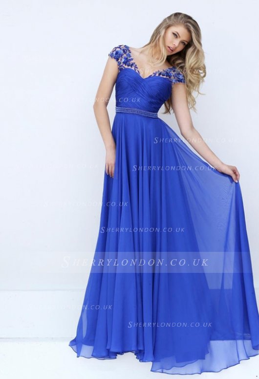 A-line Empire V Neck Flroal Lace Detailing Long Pleated Royal Blue Chiffon Prom Dress with Crystal Belt