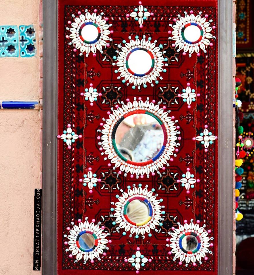 I live this wall art. This is a velvet mat decorated with shells & beads along with round mirrors embroidered nicely! How pretty is this art piece. Just amazing!