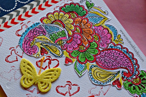 Last page of the card is so colorful, I design it with my hand doodle design & heart stamped base texture. I colored the doodle & it turned so fun! First I thought to keep it black & white but the colored version is good.