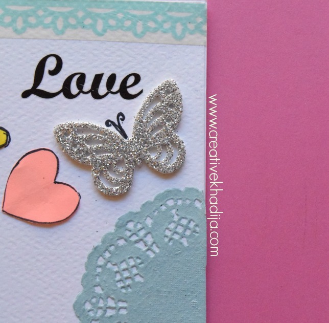 Colorful hearts in a letter envelop theme card. I used brown paper tape for envelop making & these colorful hearts I cut with scissors. You can see details of half doily piece & lace washi tape on sides of the card as well. 3d butterfly is my all time favorite.