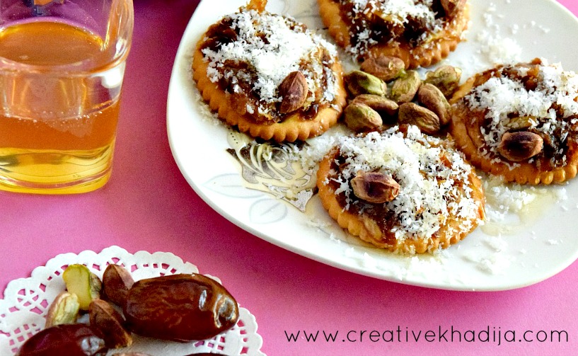 Separate date seeds & mash dates for making a paste of them. Brush some honey coat on crackers & then spread the dates paste on the cracker.