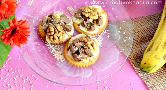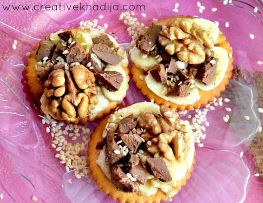 Cut bananas into slices & put thin slices on the top of crackers. Brush some honey on it & spread chocolate chunks & nuts too. I can try crushed nuts too but I prefer a whole piece of walnut here, It’s up to you whatever you liked most. Sprinkle some sesame seeds & repeat the process for other crackers too. Iftaar platter is ready now. I know it’s summers season & nuts doesn’t sound a cool idea but these are energy snacks & we all need energy after a whole day of fasting. So it’s okay! Right?