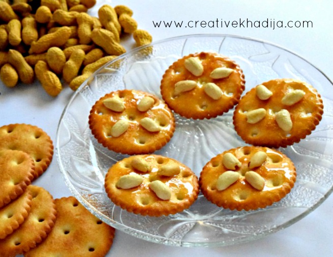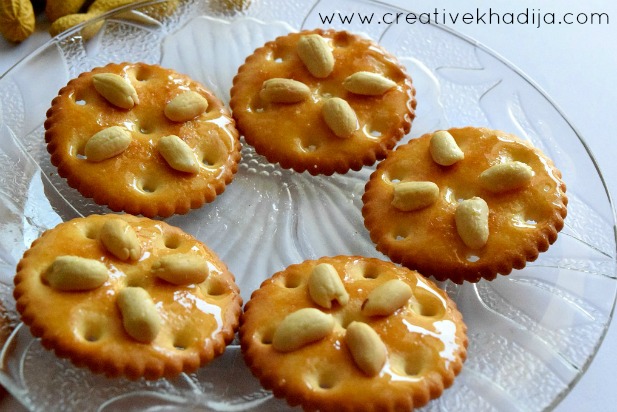 First, Make sugar caramel. You will need one cup water & half cup sugar. Boil the water in a sauce pan & mix sugar well. Let water dry & make thick sauce of sugar. Apply this caramel on biscuits before it gets cold & put peanuts on biscuits as well. You can also dust some sugar powder but also remember it will be too sweet then.