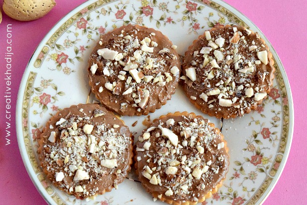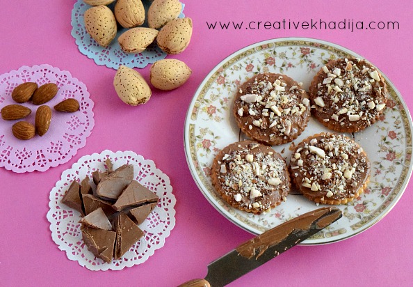 Melt some chocolate chunks. Do not melt in a pan on direct flame. Boil some water & put a glass bowl in it. Add chocolate in the glass bowl & let it melt with the heat of boiling water. Within two minutes there is a chocolate paste. Spread the paste on cracker & sprinkle crushed almonds on biscuits. Let it get cold & fix well. Ready to eat! You can also save these in an air tight jar on a cold place!