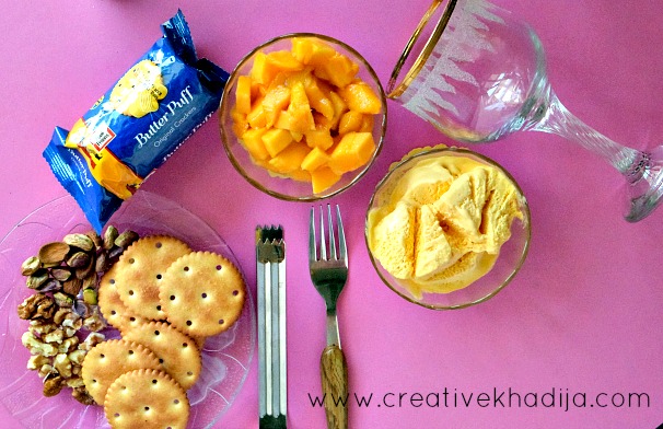 In your glass, First place two cracker biscuits & then some fruit chunks. Add some ice cream & nuts. Repeat the process & fill your glass with layers of fruit, ice cream & crackers. You can also fill some of your favorite toppings if you want.