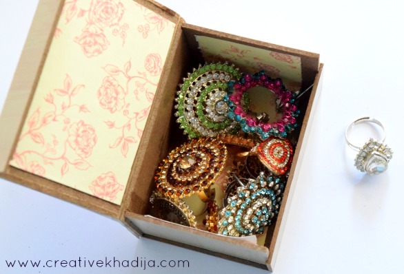 Here it is an inside look. I’ve pasted some sheets inside too. I am keeping my rhinestones decorative rings inside. These were few scattered in my drawer. I need to collect all of my other rings for organizing at one place & filling this box as well.