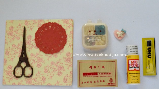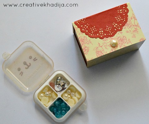 This teeny tiny box decoupaged with a scrapbook paper sheet & a piece of paper doily. Half pearl bead is just a cherry on top of the cake. Right?