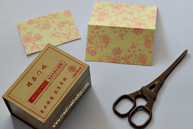 For making this jewelry storage box, First step is to cut out the paper sheets according to the size of box panels. I am not covering all of the sides of box with scrapbook sheets. As it’s a very fine Formica box, So I want to keep some sides as it is.
