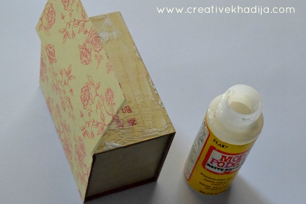 Here I have applied a thin coat of mod podge & pasted the sheet smoothly on the box.