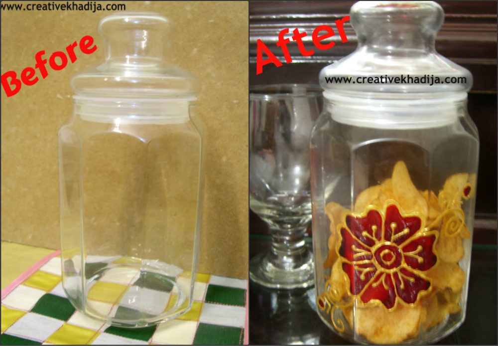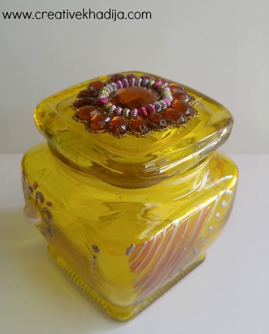 When the jar was dry totally, I design it with some random freehand dots & lines. Also I have pasted a decorative motif on the jar lid with hot glue gun.