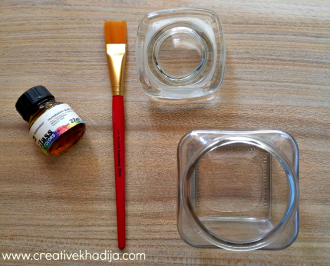 I use a flat brush for painting on the outer side of the glass jar. Within 15 minutes it was dry for further decoration work. I choose honey yellow color of glass paint.