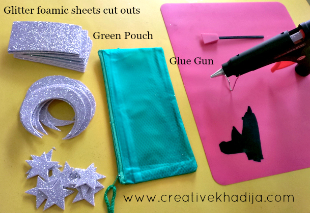 Then paste these on the pouch with hot glue gun. If you don’t want glitter stuff, you can also apply white leather or felt fabric. But I like this shimmer, So I prefer glitter foamic sheet for crafting on the pouches.