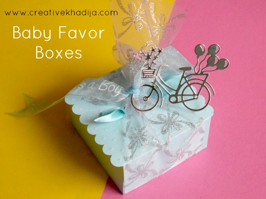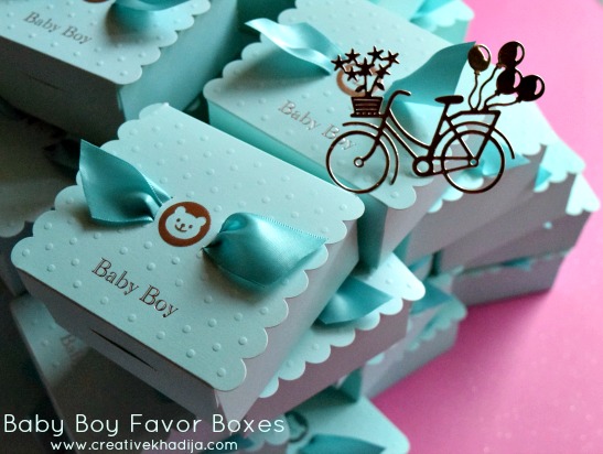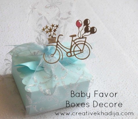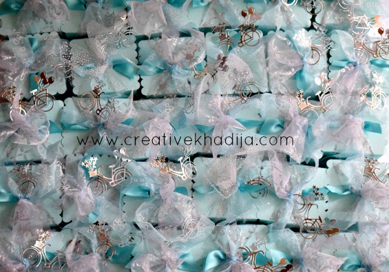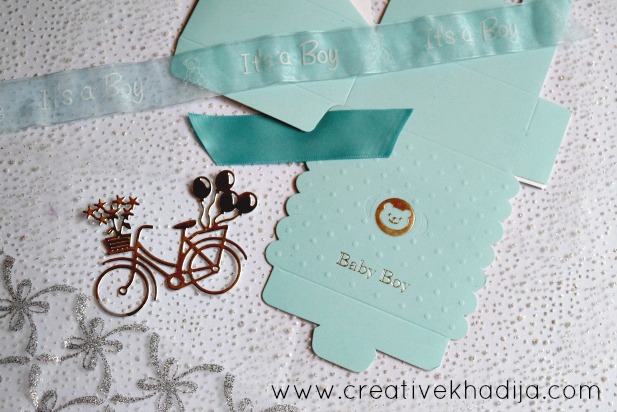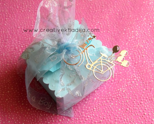 Blue color is always boyish, Right? So I decided on a baby blue color pattern for the boxes. With a touch of silver glittered organza wrap & the tiny silver bicycle tag die-cut out.