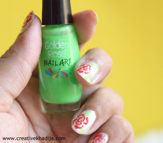 This nail art colour is with very thin brush tip, which gives perfect strokes for applying any kind of nail art. You can see the green leaf design on my nails.