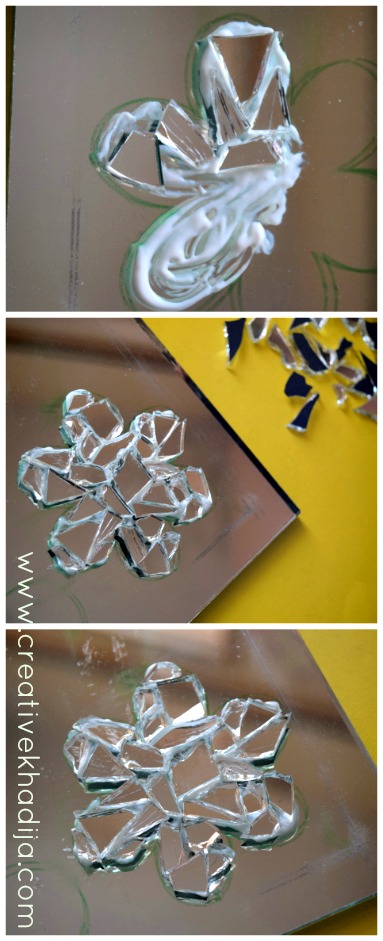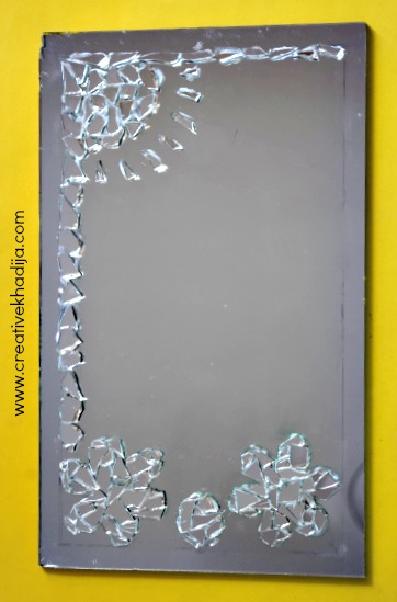 Start filling the drawing part with mirror/glass pieces. Apply glue with a brush & fix the pieces carefully. Be sure to wear rubber gloves during this process.