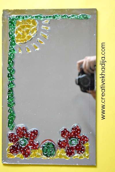 Isn’t it a colorful glass paint wall art? This time I have used some mosaic techniques. As the paints were a bit dry, so I doubt they will not be giving a smooth brush stroke on the mirror. Instead of painting them on the plain surface of the mirror, I paint them on mosaic pieces. See more steps below now!