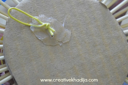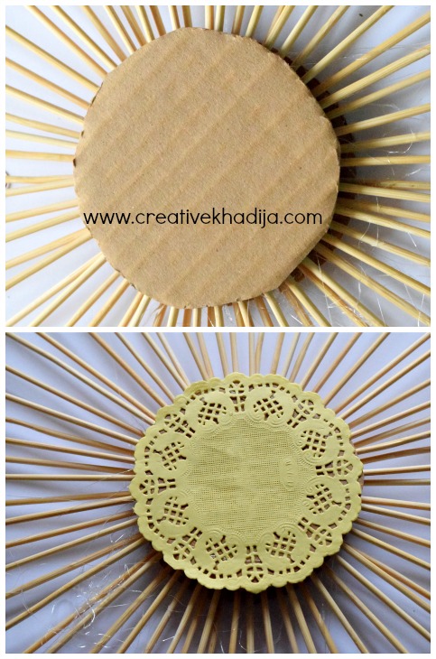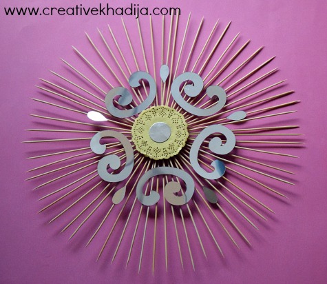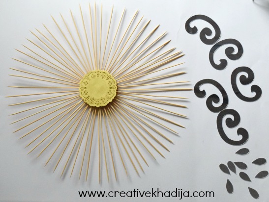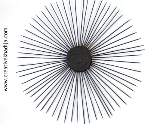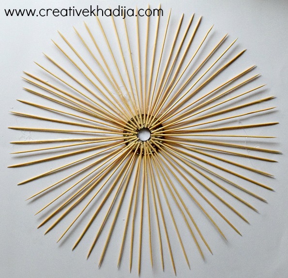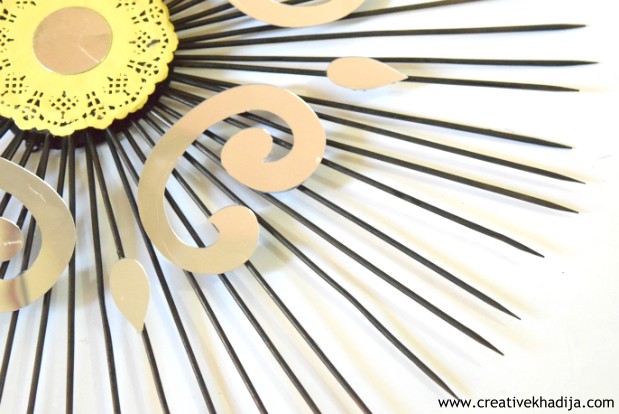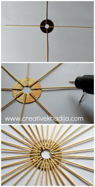 I already had these silver circles cut outs from some scrap stuff. I paste the sticks on it with a good amount of hot glue. Don’t care about glue gun strings. There will be many while sticking these on it but you will easily remove the strings when it’s done.