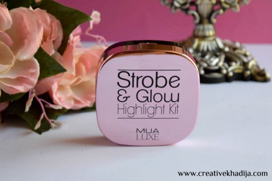 Strobe & Glow highlighting kit by MUA comes in a beautiful metallic pink packaging. There is no card packing cover & its only with a transparent sheet seal cover. In this mini kit, there is a mirror & two layers of powder & cream highlighter pallets.