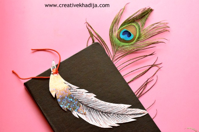 This is my favourite one. You will need to cut two feather-shaped cards in big & small size. Draw some freehand lines on it until this looks like a feather. Little feather is a silver sheet cut out. Then tie a knot to keep them both together. Also, I’ve inserted a bead with elastic thread in red color too.