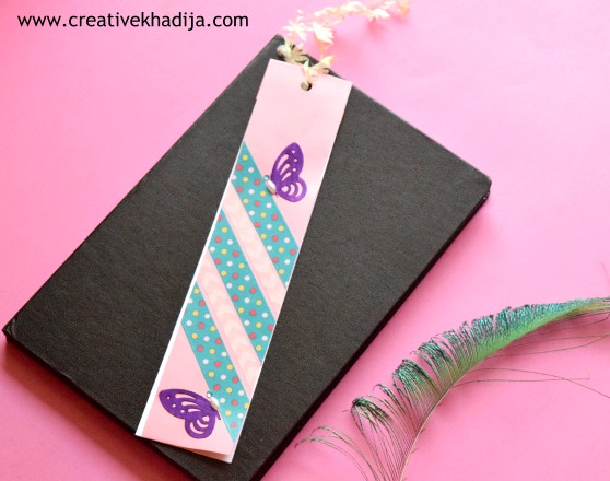 This bookmark is dual sided actually. I have applied just washi tape to it. Then punch & knot the tassel. That’s it. The other side of this bookmark you can see in the first image of this blog post. Aqua color lace washi tape on the white side of the bookmark.