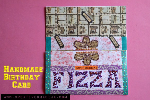 First I gave texture on the sheet with acrylic paints spray. Then I wrote Fizza on front panel of the card and filled it with glitter foamic sheet sticker chunks. On the second panel, I pasted a scrapbook sheet and some text words like Family, Dream Big, Happiness.