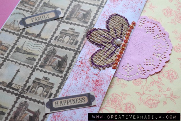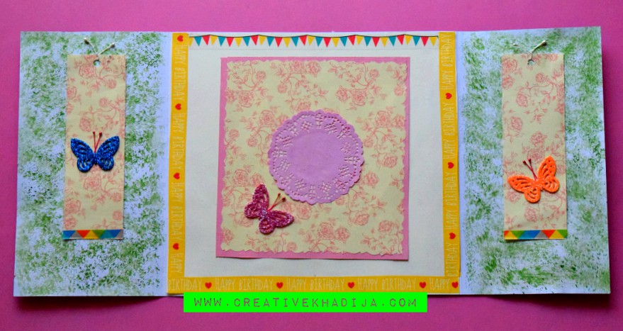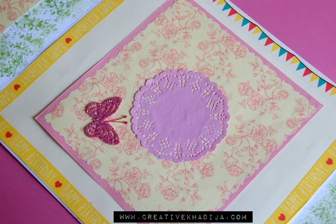 For the inside, I apply some washi tapes after the spray textures. I use “Happy Birthday” printed washi tape here. This middle square pink sheet is overlapped with scrapbook sheet. In the middle, I paste a pink doily along with a glitter foamic butterfly.
