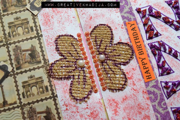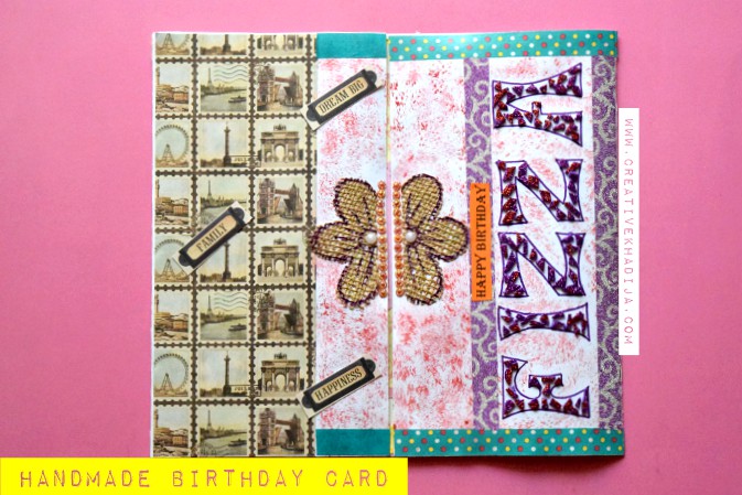 There is not step by step tutorial today but I will be explaining the whole process below. Actually I made it on urgent basis. So while working on a short notice, I skipped taking pictures of the making process. It was around 9 pm when I got a text from a friend who was searching handmade customized cards online. While browsing the Google, she saw my handmade cards images and my website. So when she requested me for the favor of making a card on urgent basis, I couldn’t refuse as She is a good friend. Have a look at what I have crafted for her.