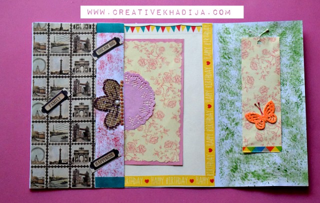 First I gave texture on the sheet with acrylic paints spray. Then I wrote Fizza on front panel of the card and filled it with glitter foamic sheet sticker chunks. On the second panel, I pasted a scrapbook sheet and some text words like Family, Dream Big, Happiness.