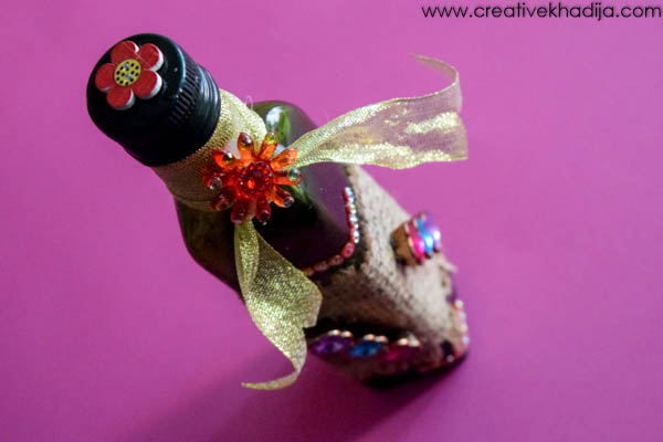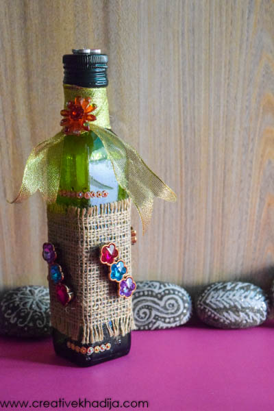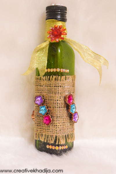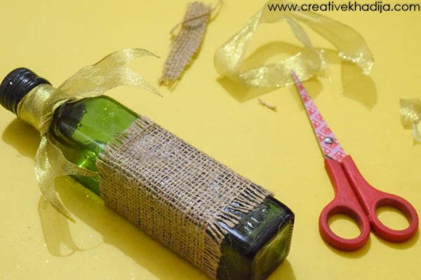 I cut a burlap fabric strip which will cover only the middle part of glass bottle. Pasted the strip on glass bottle with the help of glue.