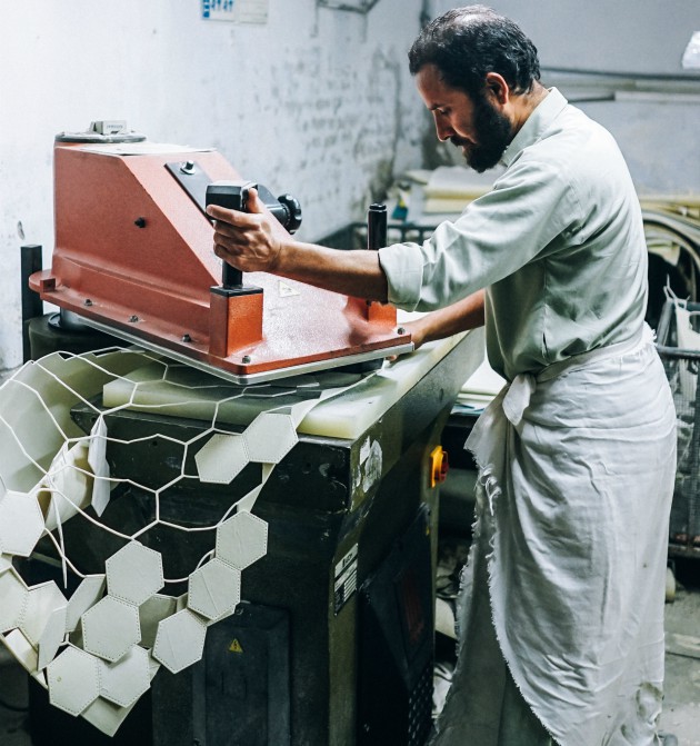 The hard work of many workers goes into the making of each football. To ensure that the shapes of all panels remain the same, they are die cut using a very accurate tool. A sheet of material is used to cut the panels, and then holes are punched into each panel for stitching.