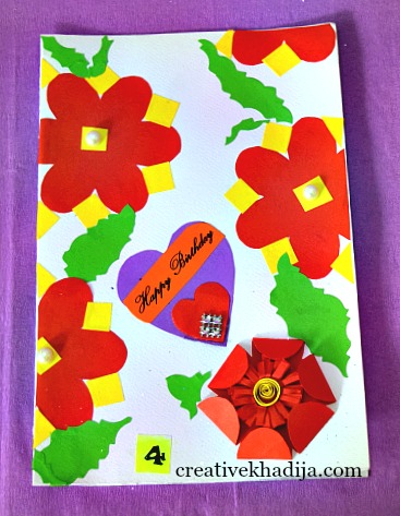 This pop-up style card is different. I cut some pieces of flower from a red sheet, Then I pasted the red sheet on a white card & filled the empty areas with different colored shapes.