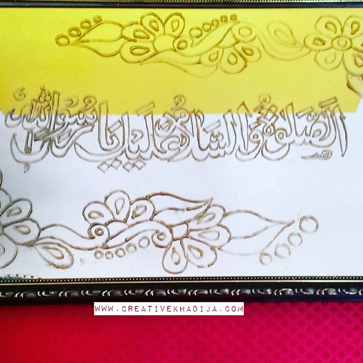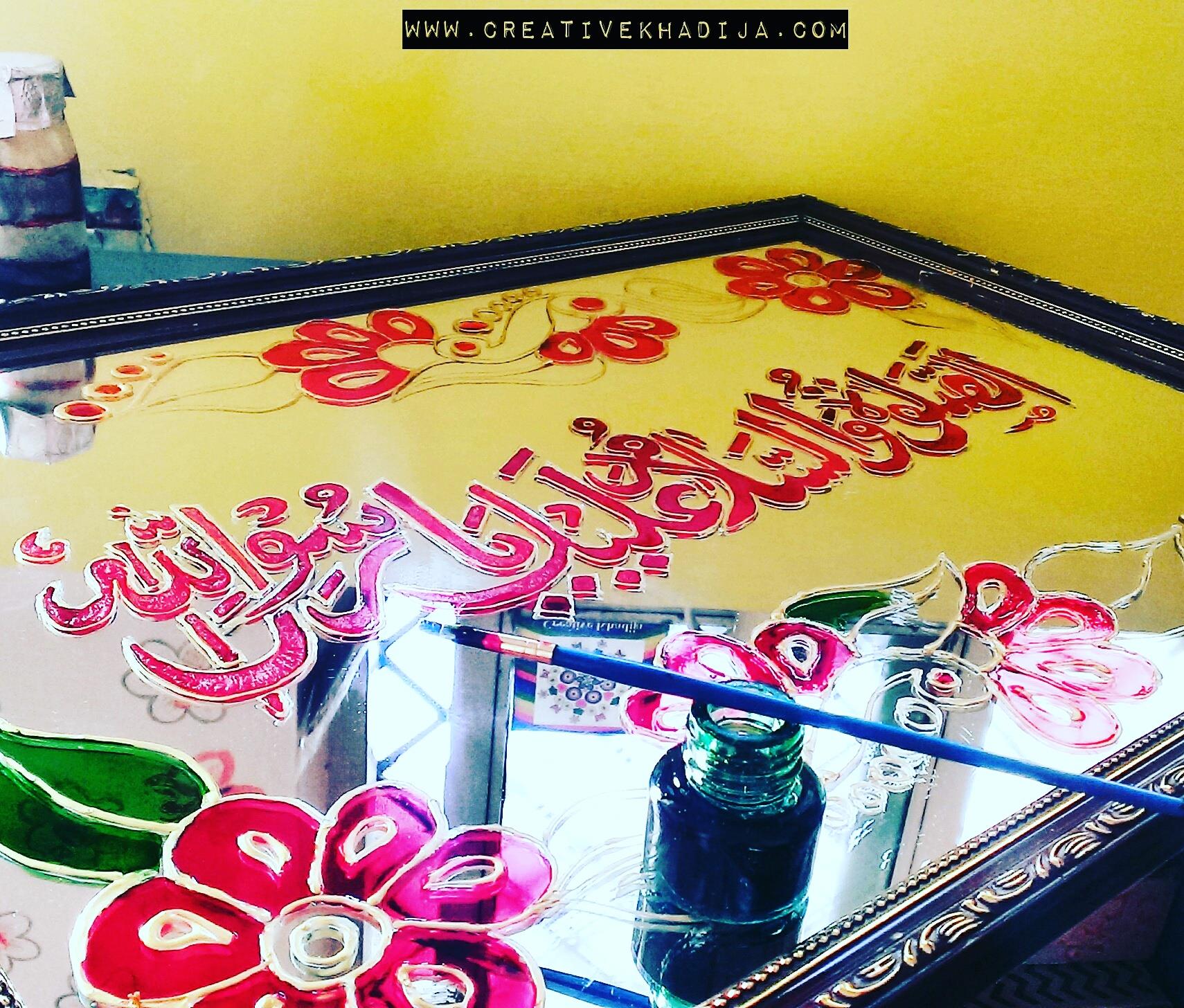 First I trace calligraphy verse on the mirror & then draw free hand floral motive with golden outliner. Let it dry for a couple hours & then it’s ready to fill colors in it.